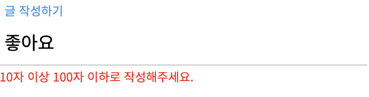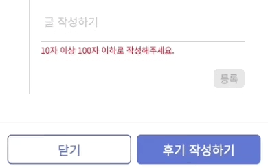 위 사진은 후기 등록 폼인데, 사용자가 10자 미만 또는 100자 초과로 글을 작성할 경우 해당 메시지가 나타나도록 했다.