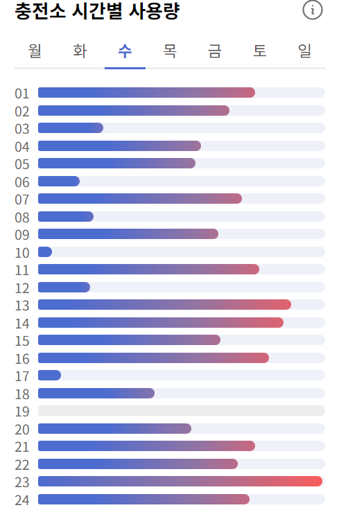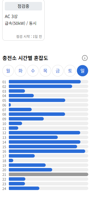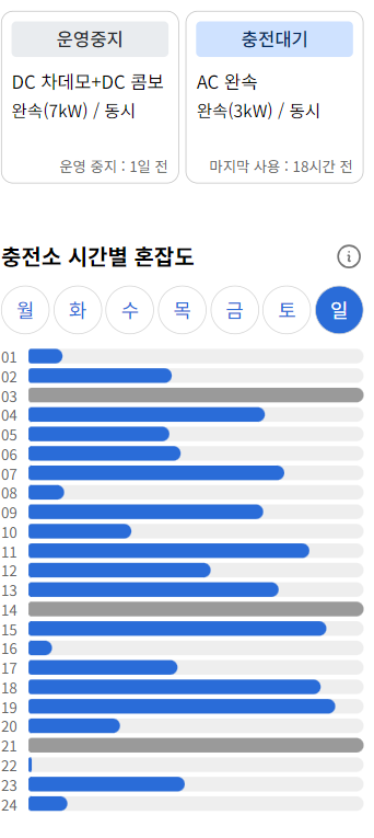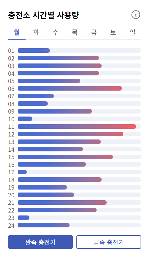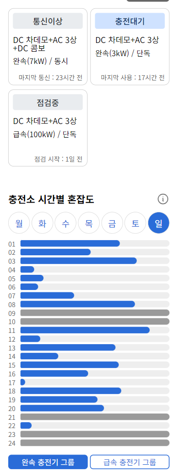 충전 속도가 느린 충전기(완속)만 있거나 충전 속도가 빠른 충전기(급속)만 있는 충전소의 경우에도 완속 충전기 그룹 버튼과 급속 충전기 그룹 버튼을 눌러 충전기 타입별로 충전소 혼잡도를 확인할 수 있었다. 하지만 완속 충전기나 급속 충전기 둘 중 하나만 있는 충전소는 버튼이 있을 필요가 없다고 생각했다.